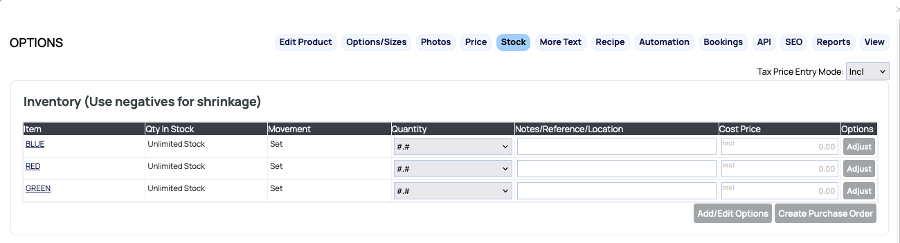 You can also edit the Stock Levels for your variations via the STOCK tab. Using this approach will allow you to SET, ADD or REDUCE stock levels if your stock levels are set to a finite value.