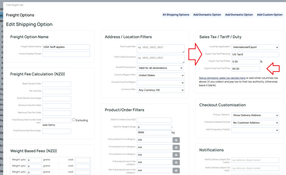 - In the Sales Tax / Tariff / Duty box, select which "local tax approach": International