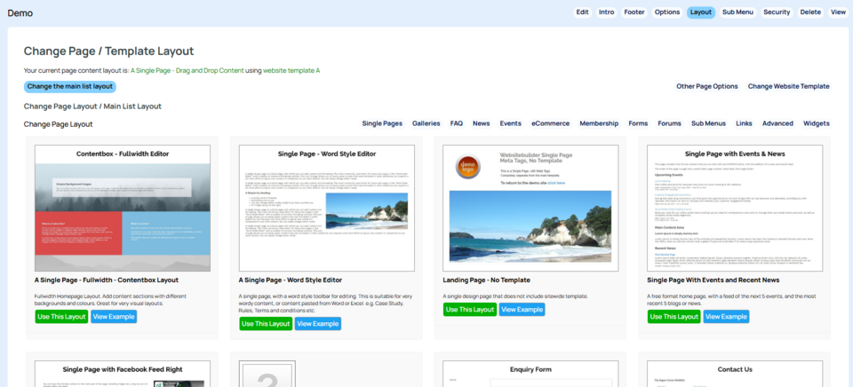 To change the page layout, select Web Pages, then the More Options cog next to the required page. Then select the Change the Page Layout button to reveal these options: