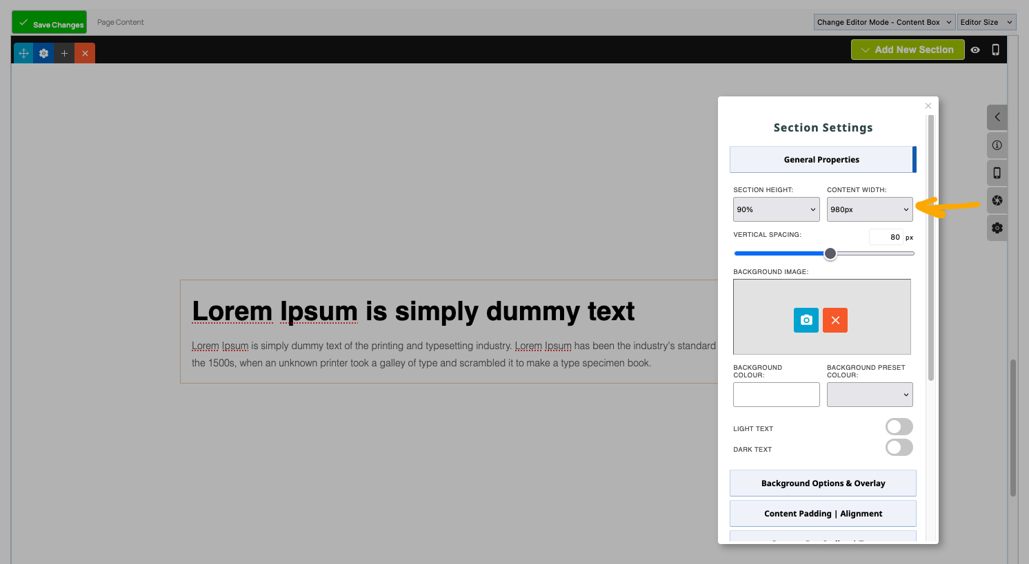 Change the CONTENT WIDTH setting to FULL if you would like the content to go full width across the screen.