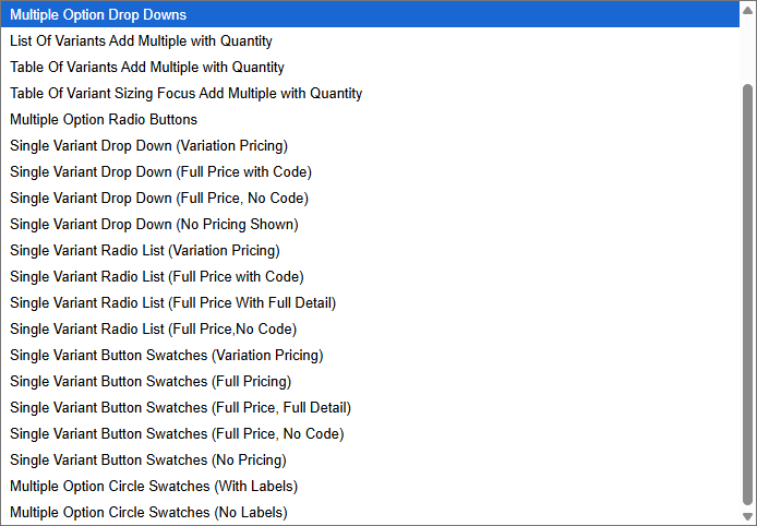 Product Variations support all formats, including single-selection layouts. Below shows some of the different formats.