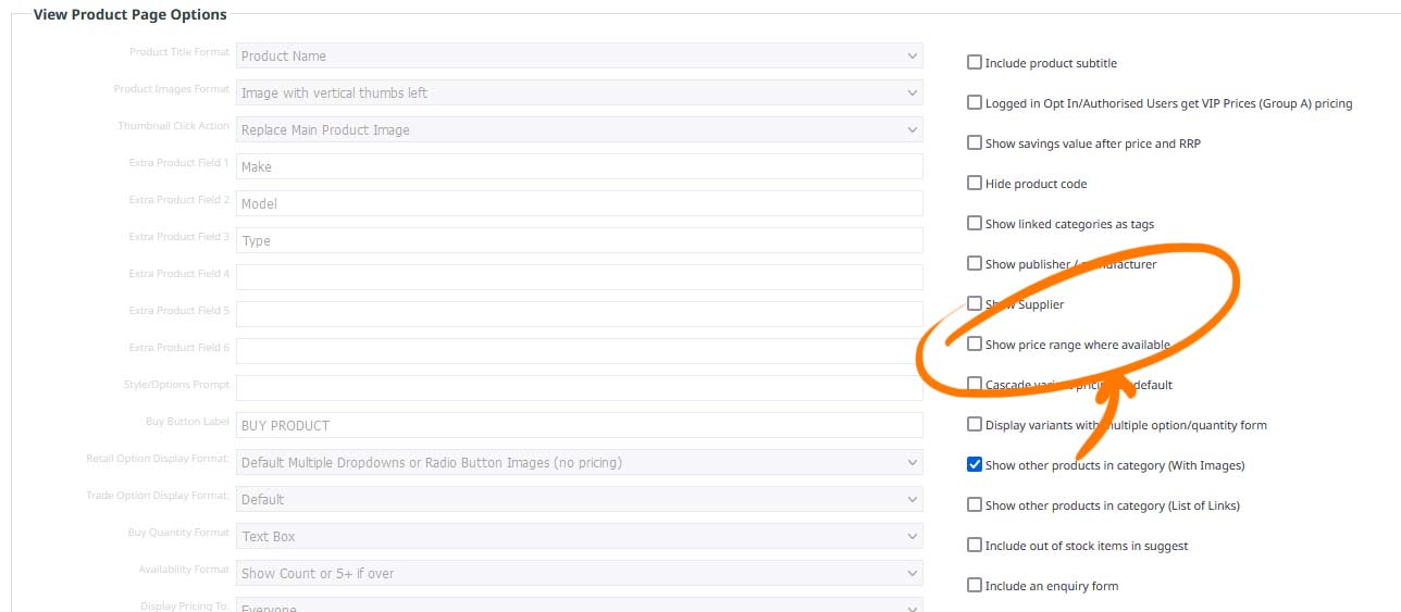 To enable this option, go to E-COMMERCE > DISPLAY OPTIONS and check the Show Price Range Where Available checkbox in the View Product Page Options area.