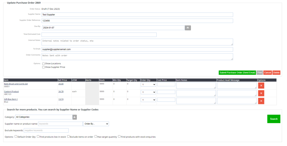 On the next screen you can add internal notes, the Purchase Order Number or Reference Number, the email the purchase order is to be sent to, order comments etc.