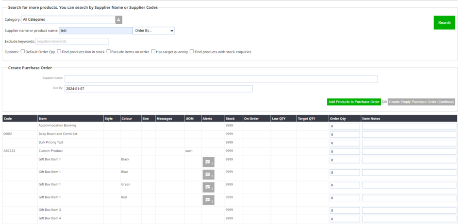 4. Once you have searched for a supplier or product, you can enter the Supplier Name and Due By date and use the Order Qty to add your Quantities.