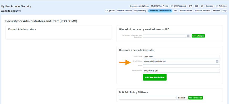 4. Enter the login Name and email address of the user, choose the required permissions (e.g. POS) and press Add New Admin Now.
