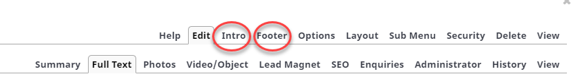 The quickest way to access these areas is to open the page as you would to edit the text within the page and then select either the Intro or Footer options from the editor tab.