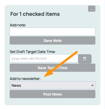 - From the options presented on the right-hand sidebar, select a page from the ADD TO NEWSLETTER dropdown field and press POST NEWS.