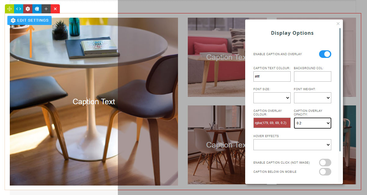 For more fine-grained control of the captions formatting, click the Link Image and Settings (RED CHAIN icon when hovering over the image) > Caption Settings area or the Style Editor (RED COG Icon on the row snippets) popup.