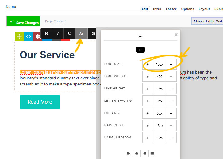 You can increase the size of any text on the page, either by selecting the required text area via click and drag, or by clicking into the text itself which will change the the entire paragraph or heading.