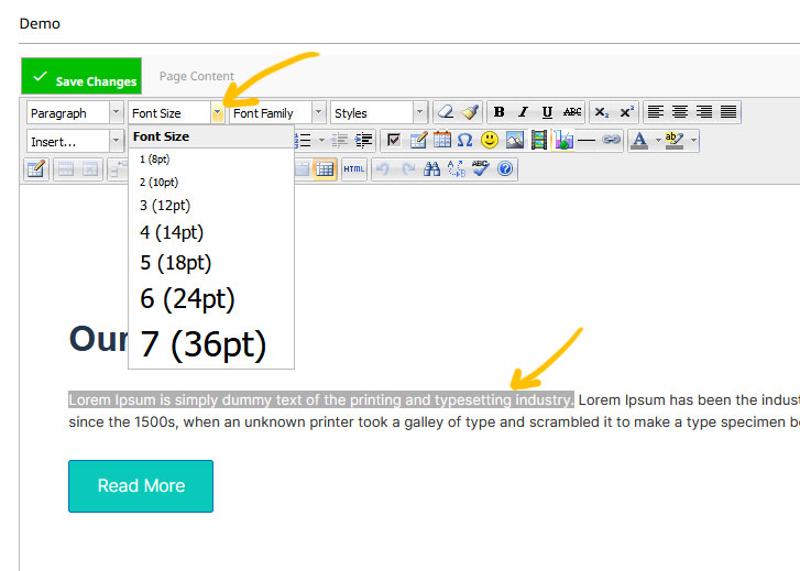 You can change the text content of your page by changing paragraphs to headings, or change the font size of text in your page.