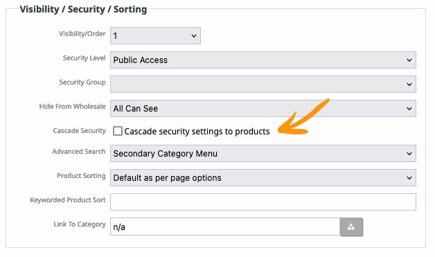 by default hiding a category does not hide the products within it. By checking the cascade security options found in the Category settings area the security setting you choose for the Categories can be applied to the subcategories and Products within.