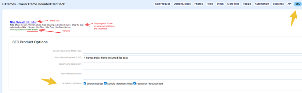 Search Robots - Tick this box to prevent search engines (like Google, Bing, etc.) from indexing the product. The product should not appear in organic search results.