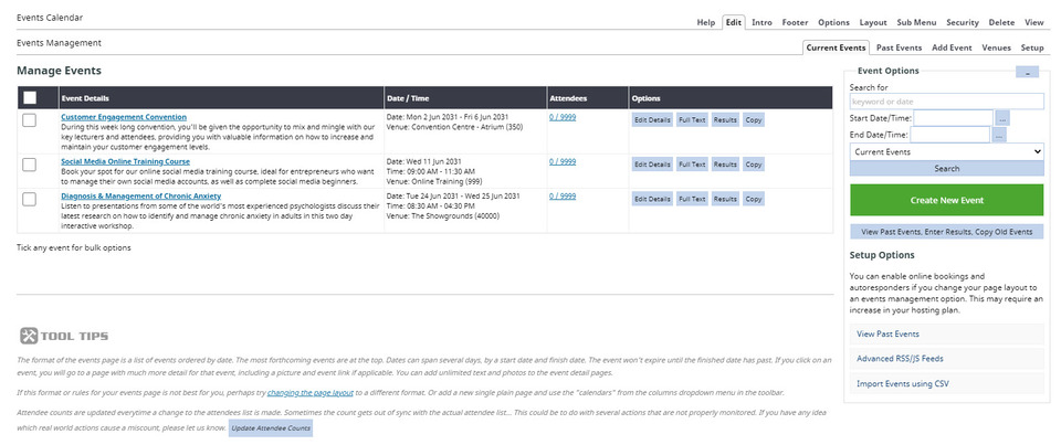 You can manage all events by using the Current Events tab which is the default page when entering the Events Management area.