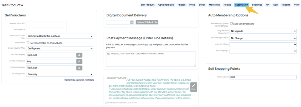 First, edit the product, or create a new product that you want associated with the voucher. Click the Automation tab at the top right.