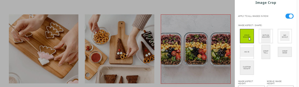 If you are displaying images in a row with varying dimensions, the crop wizard allows you to crop all of the images in one go, to a range of standard shapes. The original image file is not changed; the unwanted edges of odd sized images are simply visually hidden.