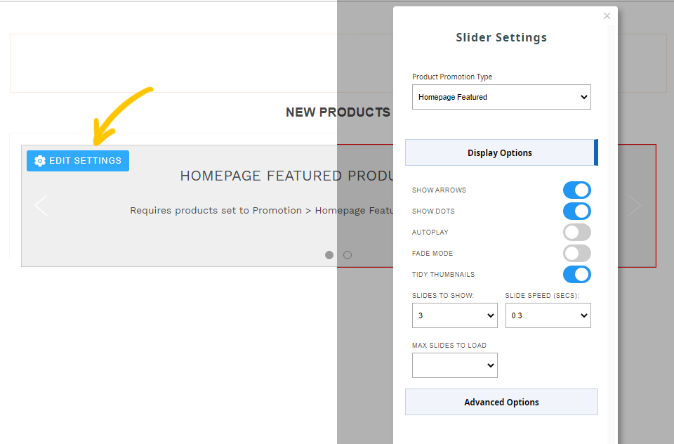 While promoting products to the homepage will add them as static images to the base of your homepage, adding the featured product slider snippet block will allow you to show your featured products in a slideshow format anywhere within your homepage content.