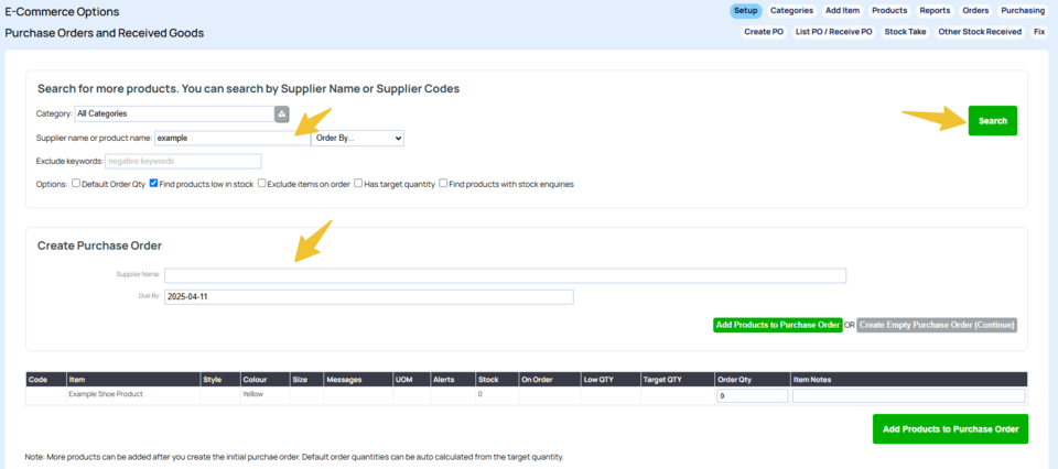 4. Once you have searched for a supplier or product, you can enter the Supplier Name and Due By date and use the Order Qty to add your Quantities.