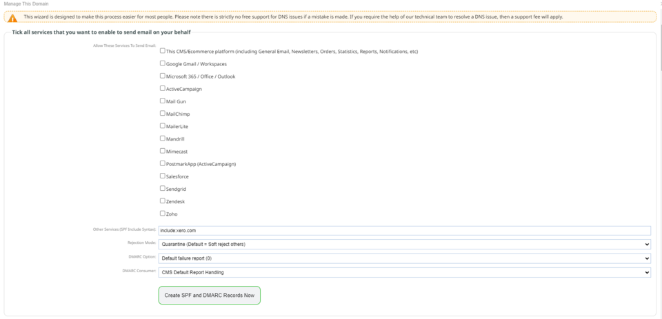 When you submit this form, a DMARC record will be created or updated with default settings (DMARC reports will be sent to our CMS platform for analysis).