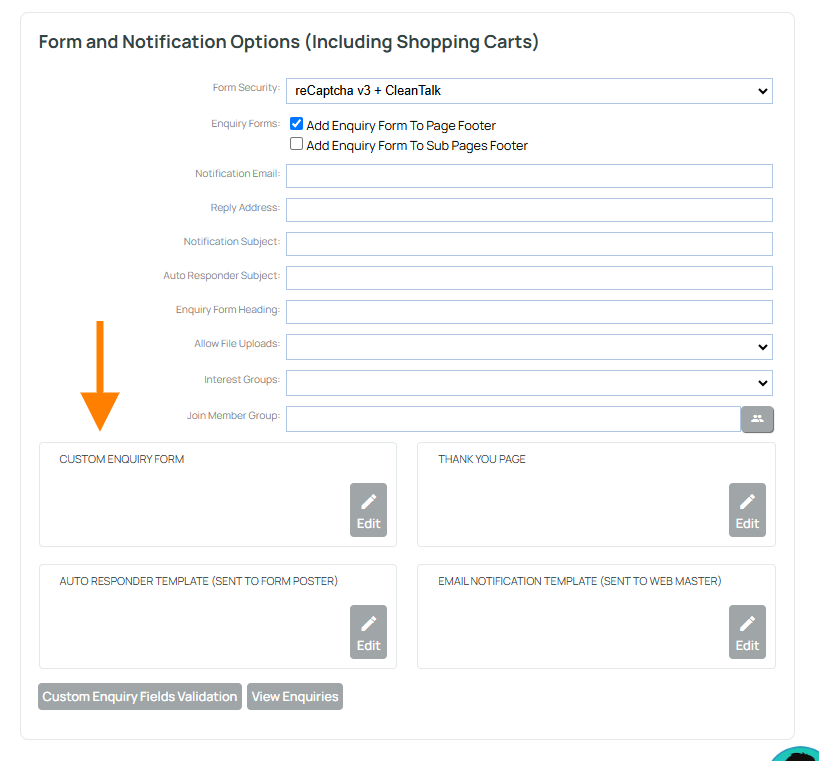 On the left hand side of the blog Summary option, you will see the area to add your email address to create a form on a blog page. After entering the email address you want the form to go to, then edit the form via the Custom Enquiry Form button.