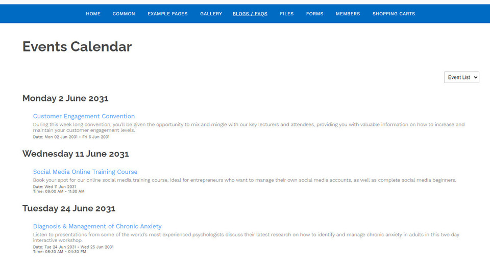 Events can be presented as a list or as a calendar. To switch between the two views, click the arrow tab on the right hand side of the Events Calendar page.