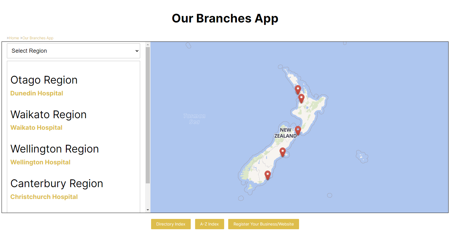 The Listing page shows the list of branches with a map of New Zealand on the right hand side. Pins show the location of the directory listings on the map.